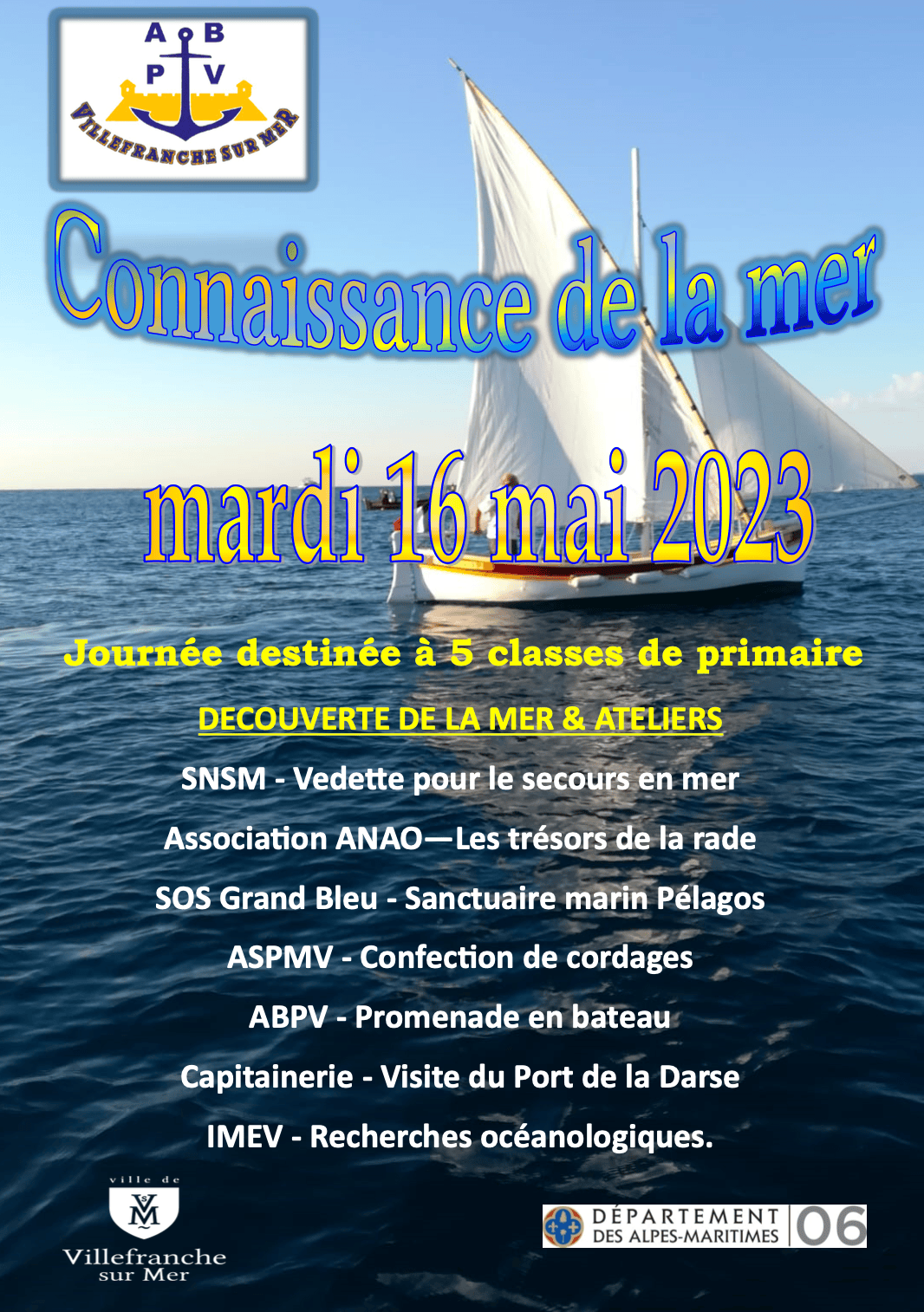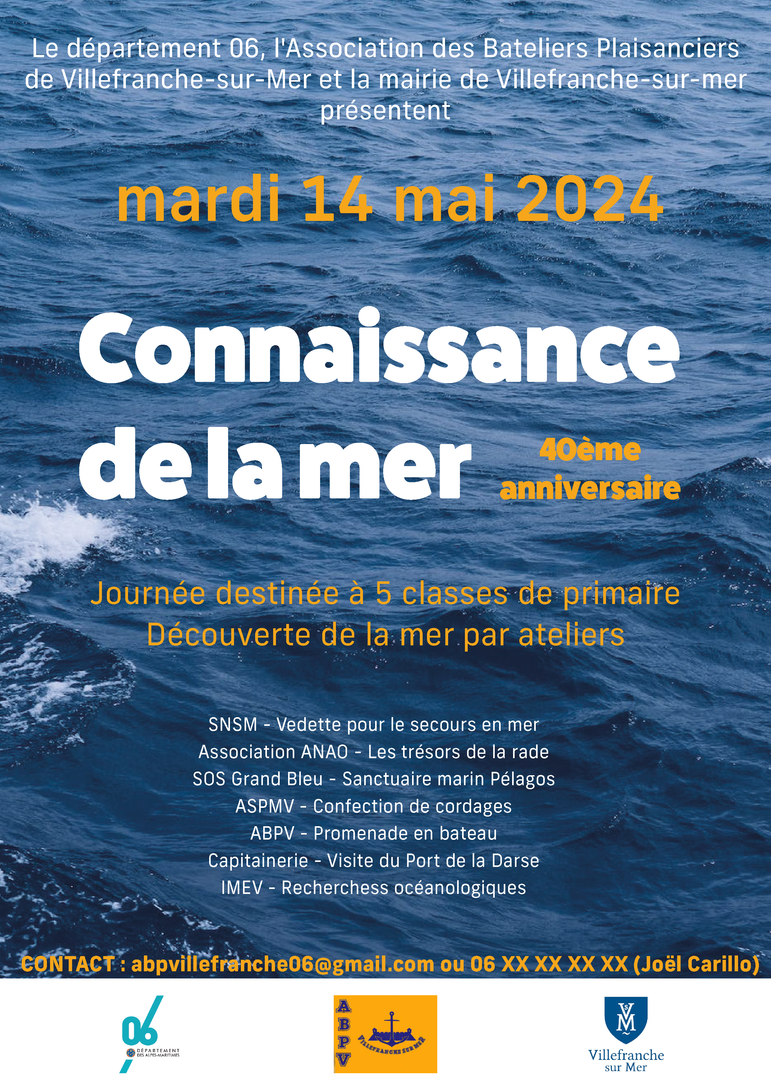 Cette affiche a été réalisée en septembre 2023, au début de ma deuxième année. Un de mes anciens professeurs du lycée, représentant de l’ABPV (Association des Bateliers Plaisanciers de Villefranche), m’a contacté pour que je modernise un de leurs supports de communication. Annuellement, l’association organise la journée « Connaissance de la mer », à destination de cinq classes de primaires, qui sont invitées à des ateliers et activités autour de la mer.